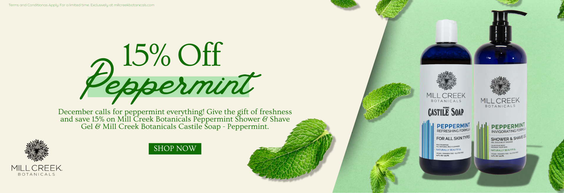 Save 15% on Peppermint Shower Gels and Castile Soap.